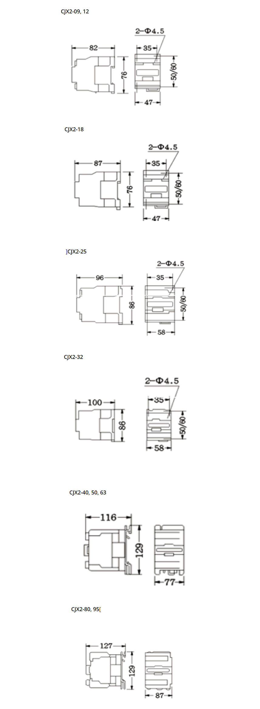 Dimensões: Contatores de Potência Tripolares CJX2